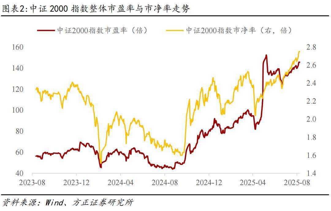 以市值因子看,小市值公司在2025年有明显超额收益。在上证50、沪深300、中证500、中证1000、中证2000等可交易规模类宽基指数中,截至8月8日,中证2000指数年内涨幅25.3%显著领先。万得微盘股指数涨幅更是超过50%持续创历史新高。从表观数据看,小微盘持续上涨后估值明显抬升。中证2000指数整体法计算的市盈率目前有146倍、市净率2.75,均为2023年指数发布以来最高。