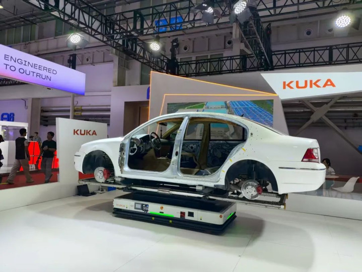 为了直观展示高负载移动机器人亿海智投,更是直接在展区C位放置了一台汽车框架。