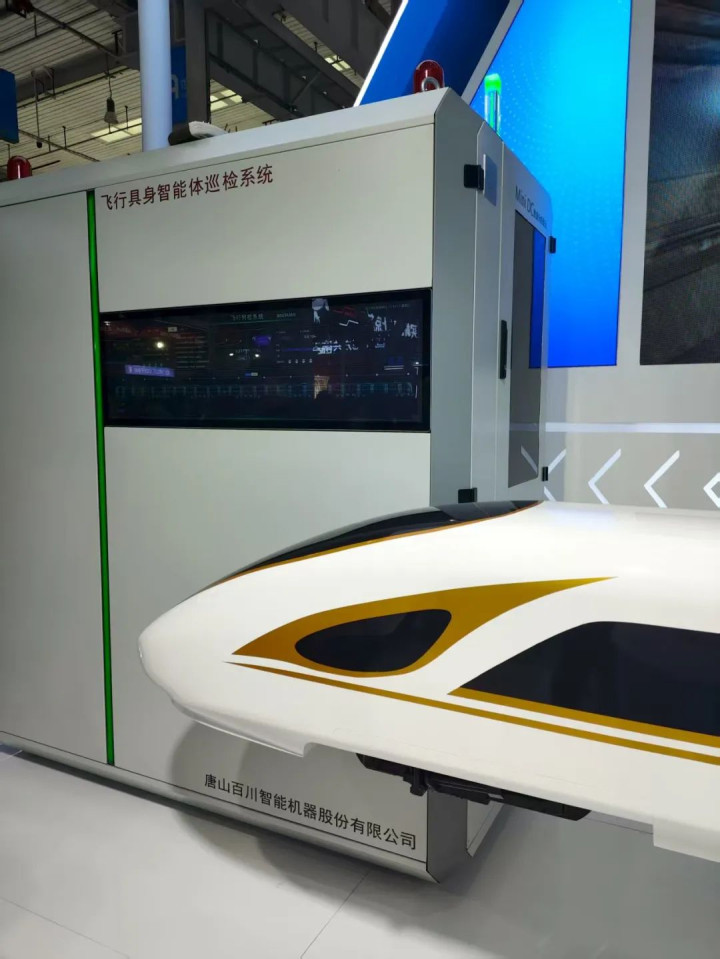 其中深耕轨道交通的唐山百川智能机器公司带来了可自主巡检的飞行具身智能体,可以满足各种特殊场景需求,例如狭窄的高铁车底、高空下的矿山桥梁等。