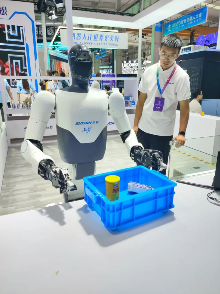 海克斯康推出首款针对工业领域的人形机器人,可以精准识别工业组件,现场还配有VR眼镜让参观者沉浸体验。