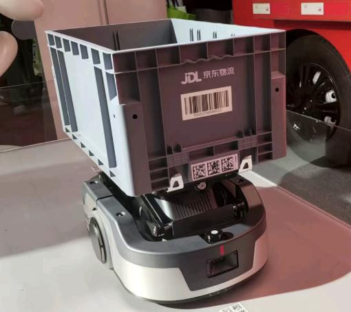 我们也看到京东带来了自家的物流机器人智狼,包括搬运机器人和飞梯机器人,可以解决12米以下标准料箱仓储环境,货架之间自由穿梭。
