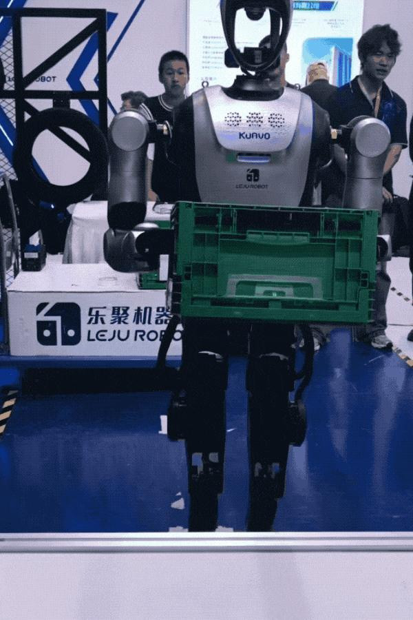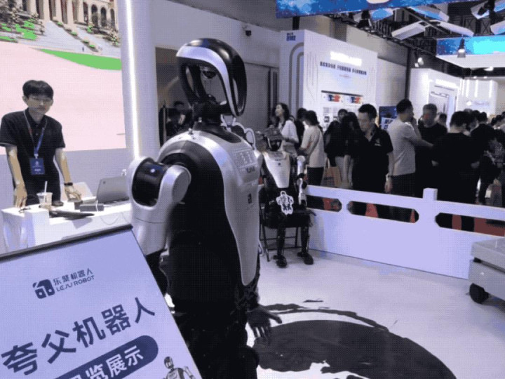 乐聚在现场展示了它们的通用人形机器人KUAVO-MY(夸父),有端到端的通用大脑架构,支持展厅导览和工业制造等领域。