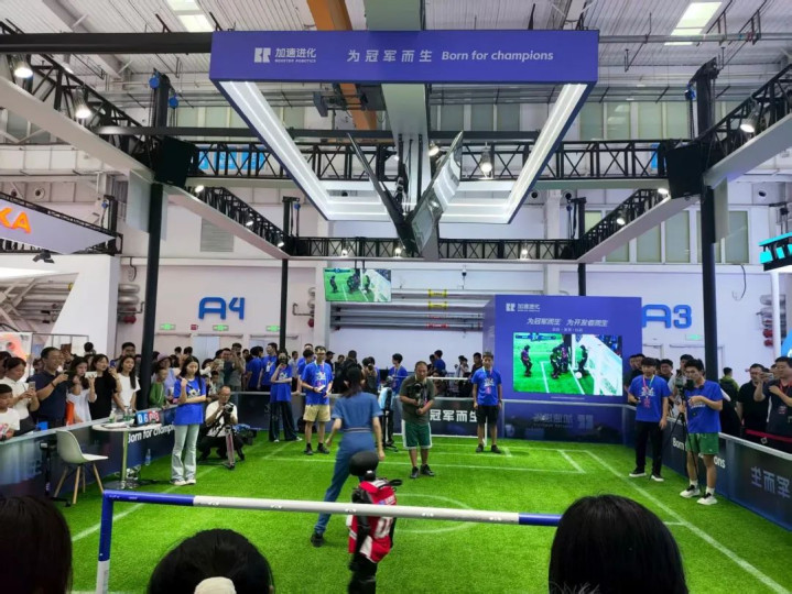 加速进化也是搬出了自家的王牌机器人T1,刚刚拿下足球世界杯冠军,就来到现场踢表演赛,观众们还能亲身参与其中,体会和机器人踢球的乐趣。