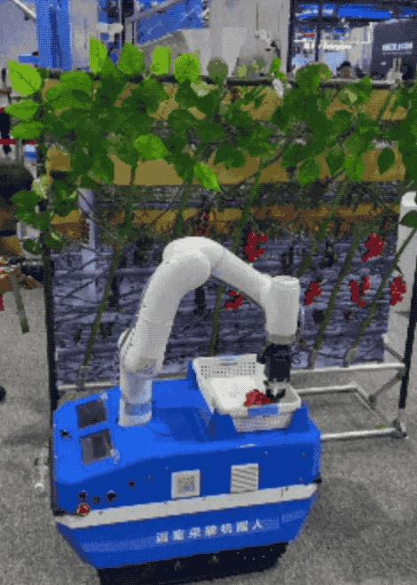 国家农业智能装备工程技术研究中心的农业机器人引得大家纷纷拍摄,灵活的温室采摘机器人现场摘番茄。