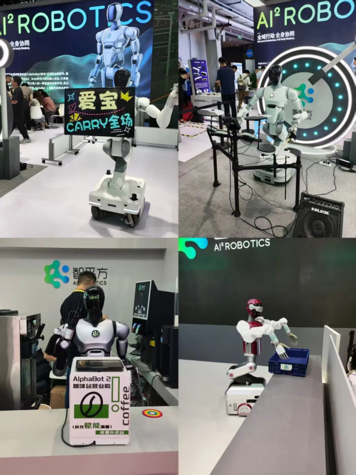 智平方这边,爱宝通用机器人开启了全能打工的一天,一会儿充当小迷妹疯狂打call,一会儿又化身炸裂鼓手,一边是咖啡店主理人,一边又跑去兼职搬砖。