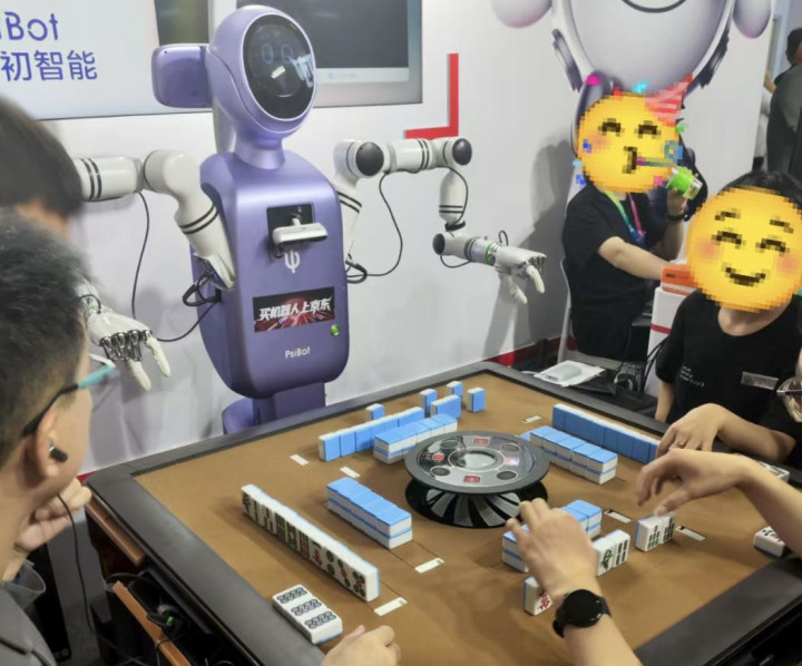 和机器人一起来搓盘麻将如何?灵初科技现场搬来一张麻将桌,随机挑选幸运观众上场一决高下。