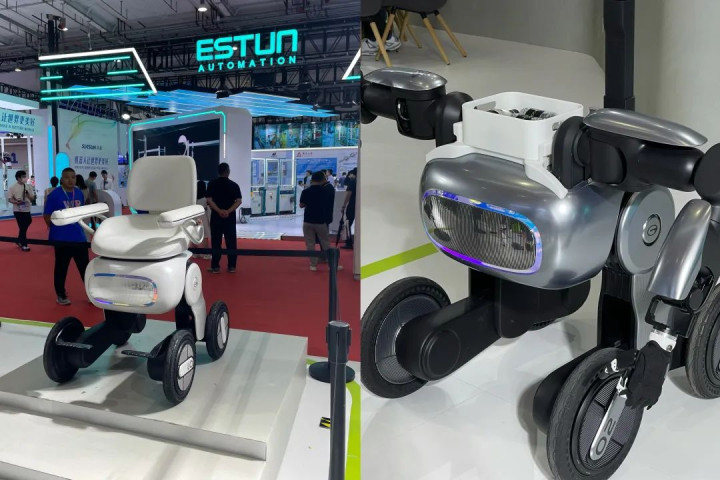 实际上这是智身科技的钢镚ZSL-1,采用高强度骨架结构与360度环绕式防护设计,最高运动速度可达3.7米/秒。